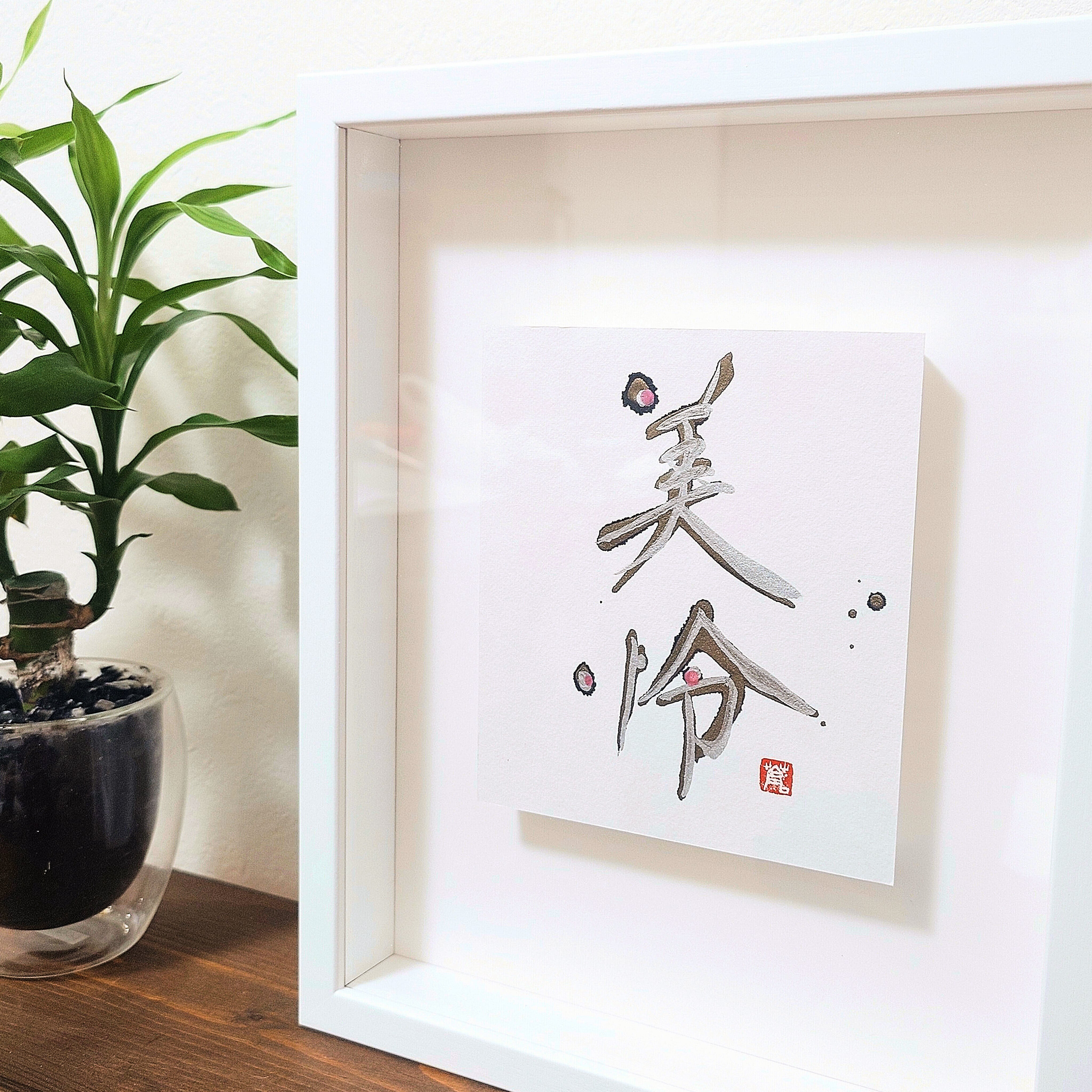 オーダーメイド:135×135mmを作品の基本寸法としてお好きな文字を書かせて頂き、200~300mmの額装仕上げにてお届けいたします。仕様によって金額や納期が変わりますが、¥17,000~ご注文可能です。お見積り致しますので contact からお気軽にご相談ください。